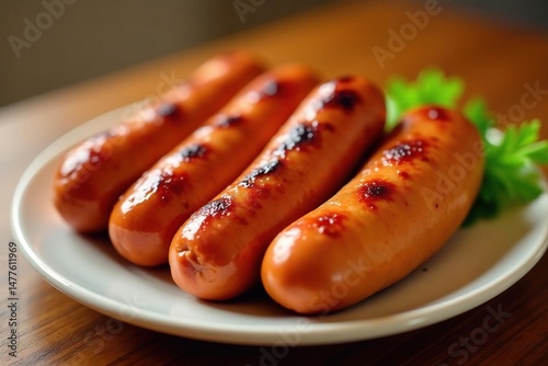 Close-up of several plump, grilled sausage hot dogs on a plate , tasty, juicy, dinner