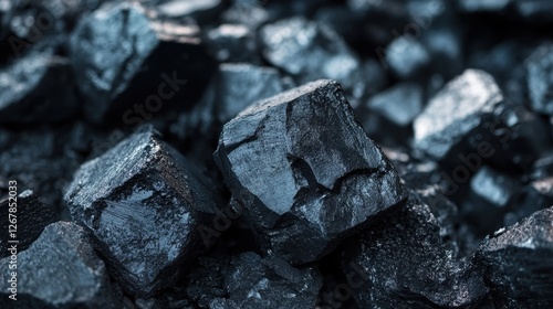 Close-up of shiny black coal pieces creating an intricate texture, showcasing their reflective surfaces and geometric shapes.