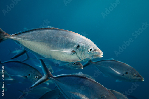 Close-up of silver trevally swimming below the ocean's surface. Photographed in South Australia in the rays of the afternoon light.