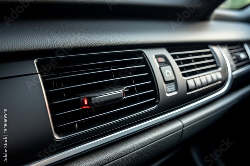 Close-up of sleek air vents and climate control buttons in a contemporary car interior