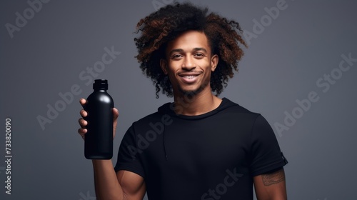 closeup of smiling man model with curly hair holding bottle of shampoo or conditioner hair product. Mock up, advertising curly care and beauty hair product, promotion banner, space for text