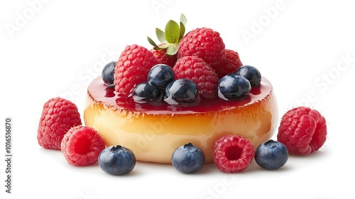 Close-up of smooth megarnished with vibrant raspberries, blueberries, and strawberries, isolated on a clean white background. Ideal for dessert-themed marketing.