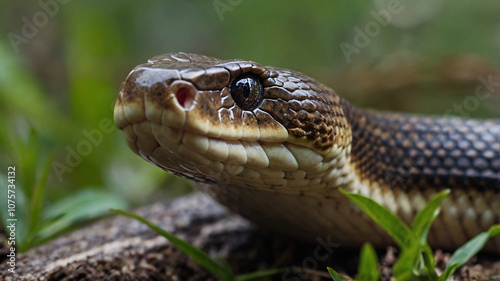 Close-Up of Snake Head in Natural Habitat. Detailed close-up of a snake's head with textured scales and intense eyes, set in a natural outdoor environment.
