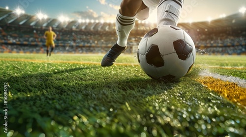 Close-up of soccer players foot in cleats kicking ball during intense football game on field