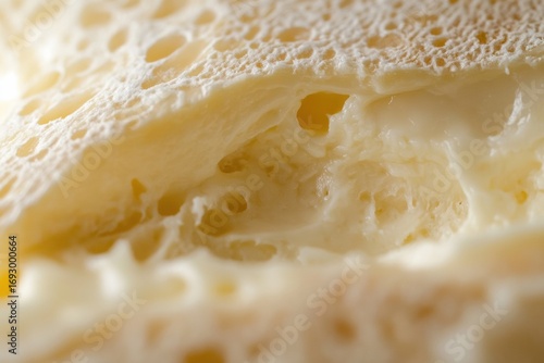 Close-up of soft, airy bread showcasing its light texture, bubbles, and creamy interior, highlighting the craft of baking during daytime in a kitchen setting