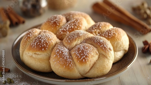 Close-up of soft Swedish Kanelbullar buns with cinnamon and cardamom, served warm on a plate. Horizontal view.