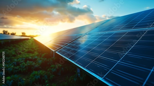 Closeup of Solar cell farm power plant eco technologylandscape of Solar cell panels in a photovoltaic power plantconcept of sustainable resources : Generative AI