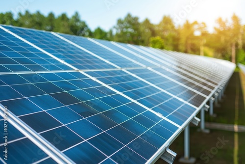 Close-up of solar panels in a field, capturing clean energy from the sun on a bright sunny day, promoting sustainable and renewable energy sources.