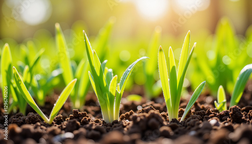 Close-up of sprouting green grass in garden soil, spring awakening