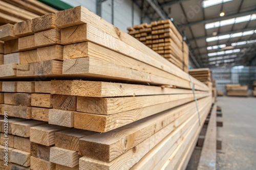 Close-up of stacked timber planks in carpentry warehouse. Wooden texture background showing natural grain, hardwood material, lumber for construction, woodworking, and industrial design purposes.