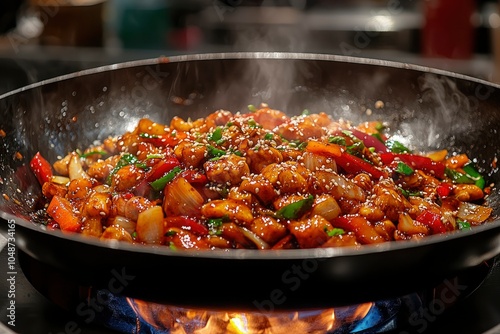 Close-up of Steaming Chicken Stir-fry with Sesame Seeds in a Wok on a Stovetop