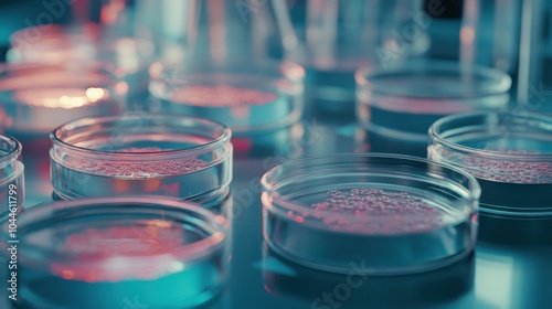 Close-up of stem cells in petri dishes, surrounded by precision tools for scientific breakthroughs in stem cell research. Laboratory setting