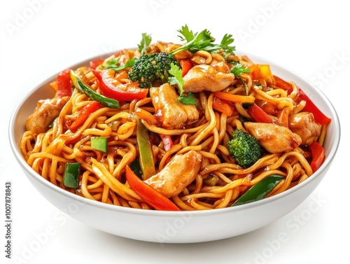 Close-up of stir-fried noodles with chicken, peppers, and carrots in a savory sauce Isolated on white background