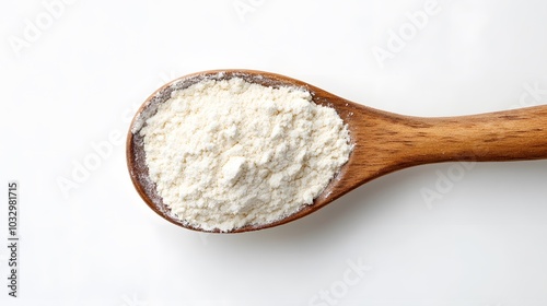 Close-up of tapioca starch or flour powder in wooden spoon on white background.