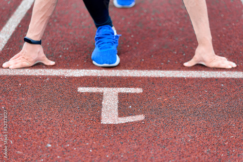 Close-up of the athlete's arms and legs at a low start on the first treadmill in the stadium. Marathon athlete prepared for the race at the competition on the first track