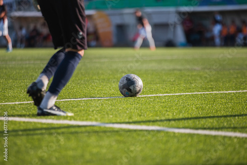 Close-up of the ball on the green lawn of the football field - the goalkeeper puts the ball into play