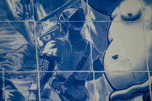 Closeup of the blue mosaic of the facade of the Carlos Lopes pavilion located in the Eduardo VII park of Lisbon, the hilly coastal capital city of Portugal