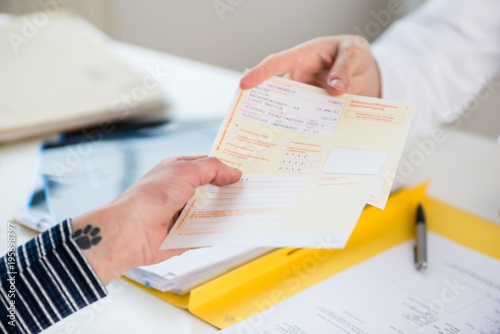 woman, physician, doctor, prescription, patient, health care, medicine, apothecary, pharmaceutic, woman, 2, female, young, health care, medicals, practitioner, professional, occupation, hospital, health, center, clinic, indoor, day, gown, white, closeup, copy space, insurance, caucasian, giving, receiving, printed, paper, hand, desk, receipe, make well, individual, personal, drug, remedy, medication, pharmaceutical, treatment, tattoo, activist, paw, animal rights