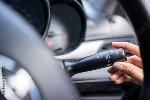 Close-up of the hand turning on the headlight control switch