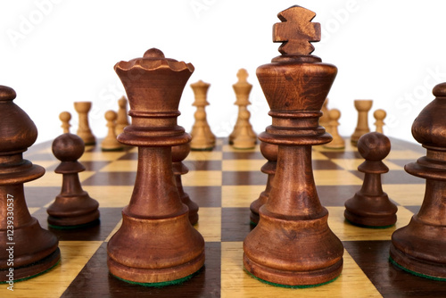 Close-up of the starting position in the chess game on wooden chessboard and chess pieces, view of the white opponent between the black queen and the black king through the chessboard