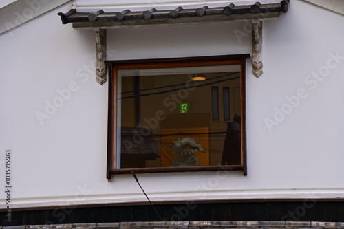 Close-up of the window of a building from the view of street in Kyoto Japan. A decoration in the window with the exit sign in the background.