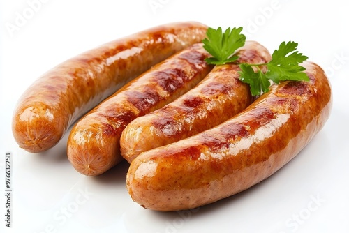 Closeup of three grilled bratwurst sausages with parsley garnish on a white background. Perfect for menus, food blogs, and advertising.