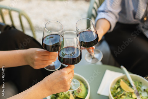 Close-up of three women having lunch outdoors making a celebratory toast with glasses of red wine