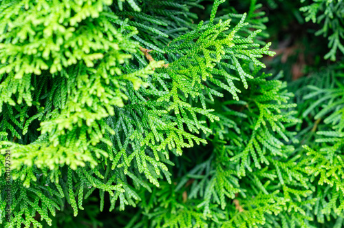 Close-up of Thuja evergreen foliage with vibrant green color and fine texture