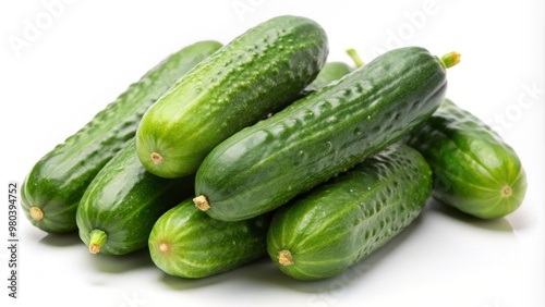 Close-up of tiny, fresh baby cucumbers with miniature tails against a white background