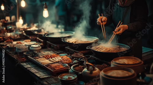 Close-up of traditional Asian street food being served at a night market, steam rising, warm lights, chopsticks, vibrant and authentic travel scene