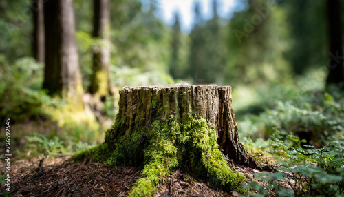 Close-up of tree stump with green moss in woodland. Beautiful forest.