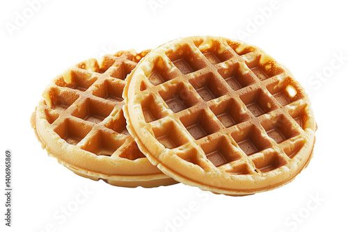 Close-up of two crispy golden waffles stacked together isolated on white background, concept of breakfast and sweet food.