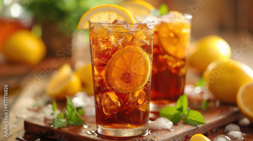 Close-up of two glasses of iced tea with lemon slices and mint leaves on a sunny outdoor table.