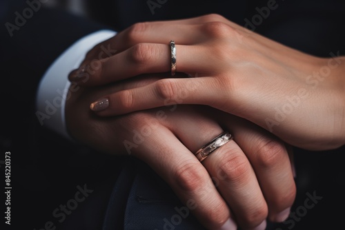 Close-up of two hands exchanging wedding rings, soft focus on the background, intimate moment