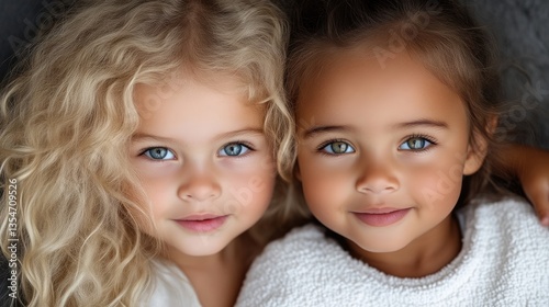 children, girl, children, twin, sister, friends, portrait, cute, adorable, beautiful, pretty, childhood, family, friendship, happy, smiling, eye, look, face, closeup, curly, hair, blond, brown, diversity, multiracial, hugging, hugs, tender, affectionate, closeup, soft, peaceful, innocence, sweet, playful, tenderness, love, calm, joyful, lovely, hug, sibling, precious, photo, image, close