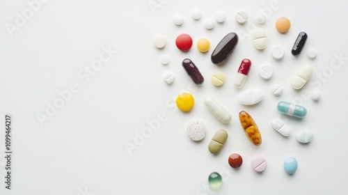 closeup, various, medication, pill, arranged, artistically, pristine, white, surface, scientific, style, photo, macro, shot, highlighting, detail, pharmaceutical, product, ample, space, center, text, high, quality, image, health, wellness