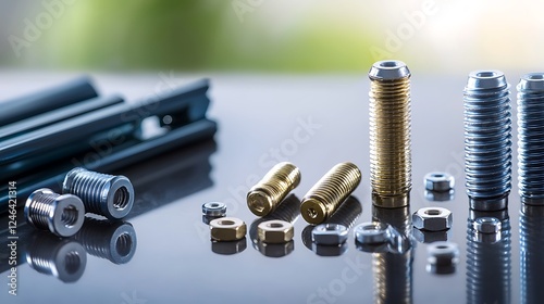 Close-up of various metal fasteners and components arranged on a reflective surface