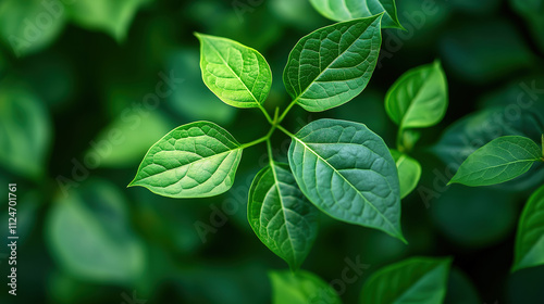 Close-up of vibrant green leaves in a lush natural setting. This close-up image showcases a cluster of vibrant green leaves, highlighting their intricate textures and details.