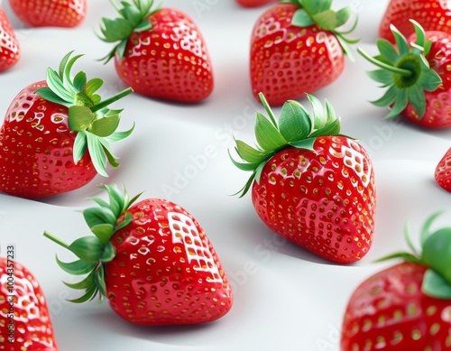 Close-up of vibrant, juicy strawberries with lush green leaves, showcasing their freshness and natural texture against a clean white background