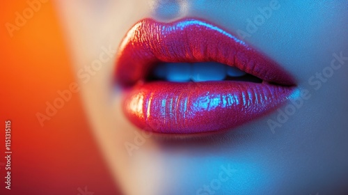 Close-up of vibrant lips adorned with bold lipstick, softly reflecting light against a blurred background.