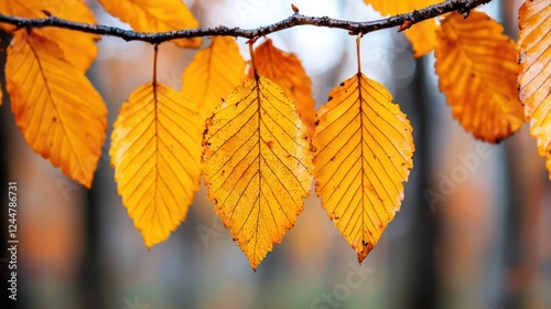 Close-up of vibrant orange autumn leaves hanging from a branch in a forest setting.