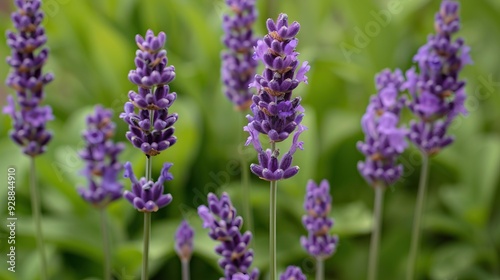 Closeup of vibrant purple lavender flowers in bloom against blurred green background Aromatic herb garden Floral beauty Natural remedy ingredient Fragrant plant