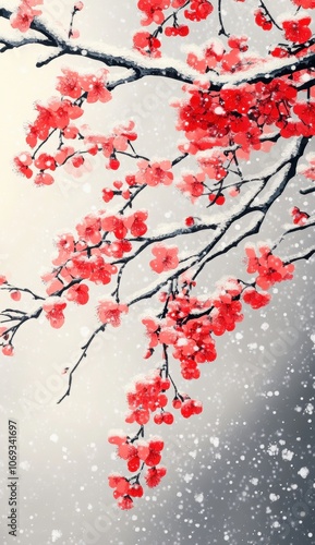 red flower, snow, winter, blossom, nature, floral, tree branch, cold, seasonal, landscape, natural beauty, serene, contrast, delicate, scenic, environment, winter scenery, botanical, snowflake, peaceful, artistic, photo, macro