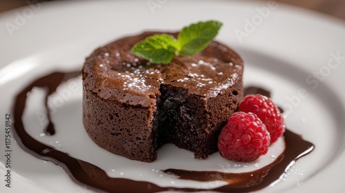 Close-Up of Warm Chocolate Brownie with Raspberries and Cream on a White Plate