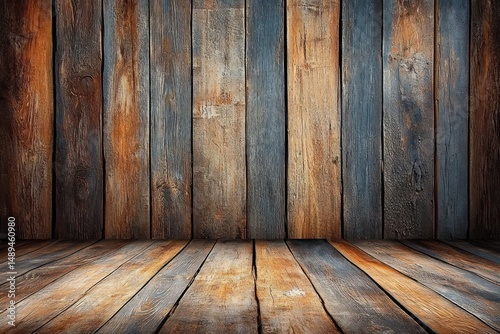 Close-up of weathered wooden wall and floor with varying shades of brown and gray showing natural textures and aged wood grain