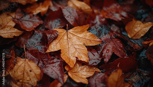 Close-Up of Wet Autumn Leaves with Water Droplets