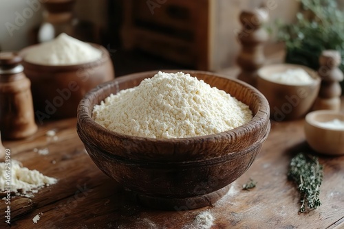 closeup of white flour in a rustic wooden bowl delicate texture visible emphasizing the purity and simplicity of the ingredient surrounded by warm earthy tones