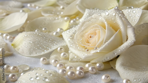 Close-up of white roses and petals adorned with water droplets and pearls, creating a luxurious and romantic composition. Perfect for wedding themes, invitations, and elegant designs.