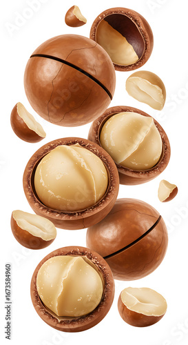 Close-up of whole and cracked macadamia nuts with shell and kernel isolated on white background, perfect for food packaging and culinary use