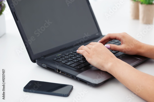 Closeup of woman hands working with laptop.